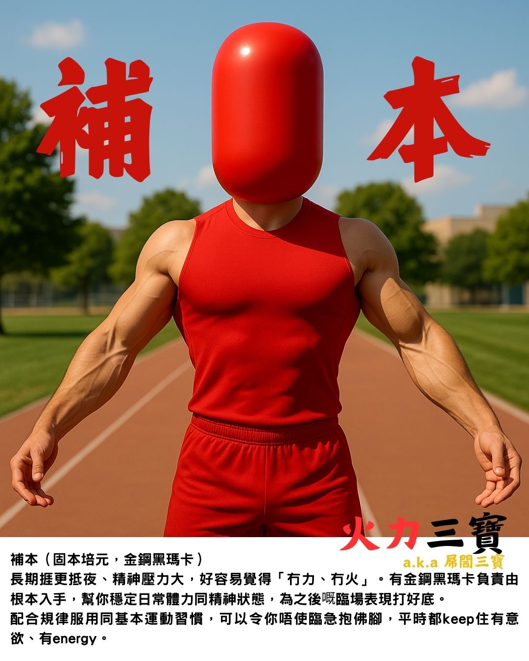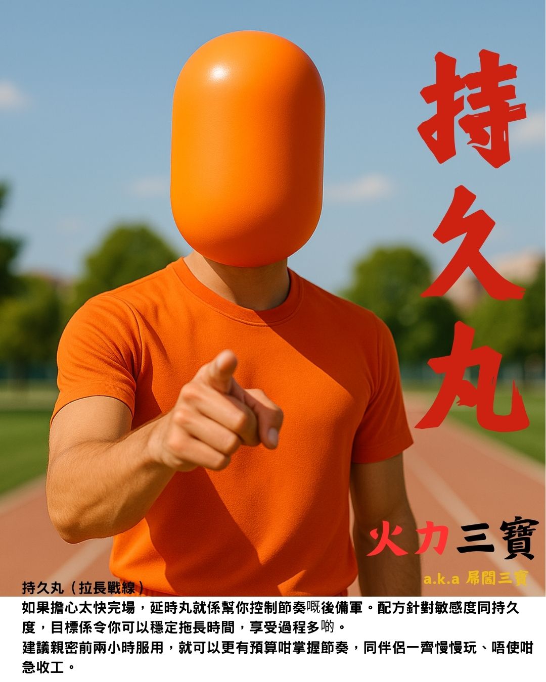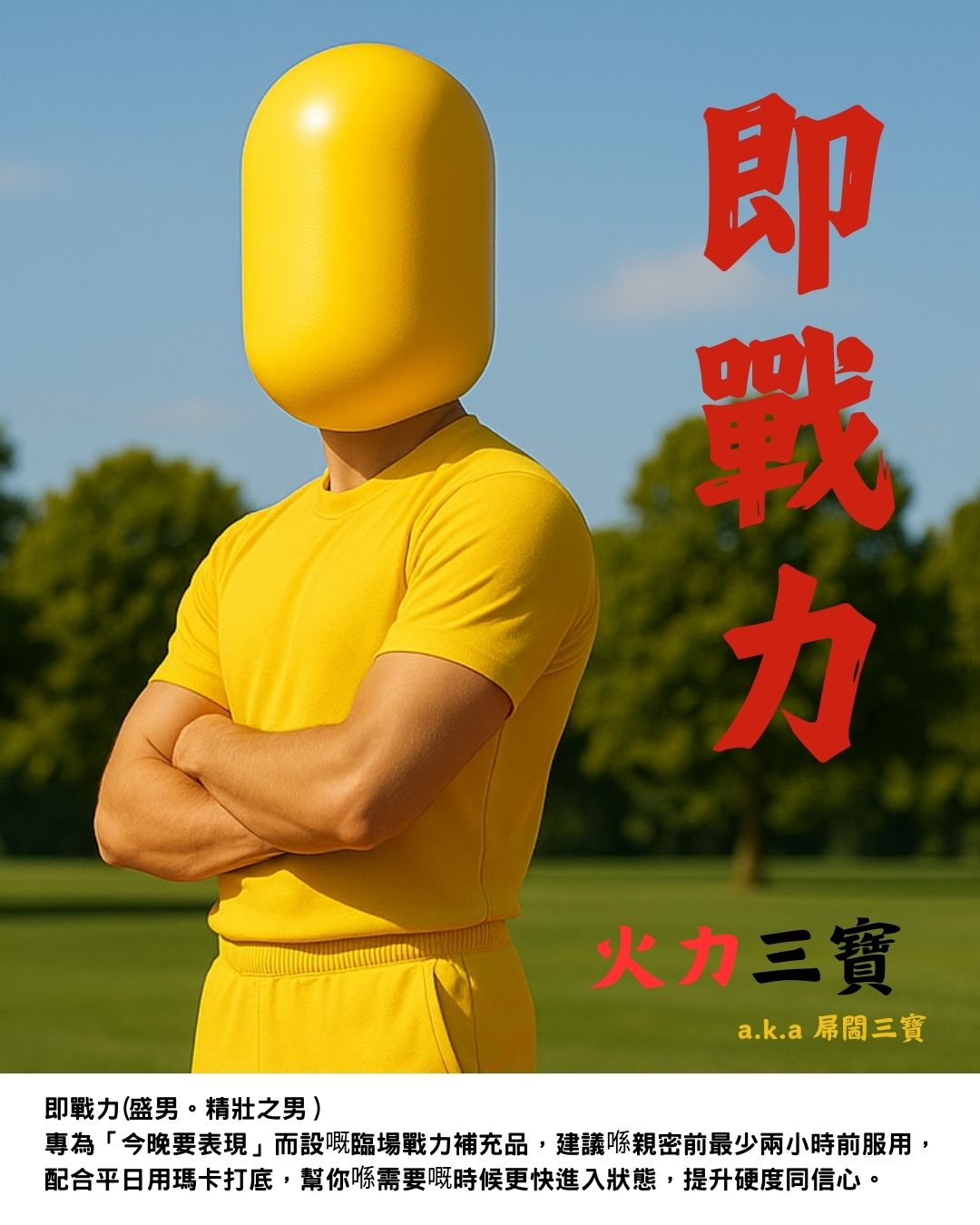 由穩固根基、臨場應戰,到延長表現,一套「三寶」幫你按需要出招,清晰食法、安心配搭。 1. 補本(固本培元,金鋼黑瑪卡打個穩陣底) 長期捱更抵夜、精神壓力大,好容易覺得「冇力、冇火」。有金鋼黑瑪卡負責由根本入手,幫你穩定日常體力同精神狀態,為之後嘅臨場表現打好底。 配合規律服用同基本運動習慣,可以令你唔使臨急抱佛腳,平時都 keep 住有 energy、有意欲。 2. 即戰力 (盛男。精壯の男) 專為「今晚要表現」而設嘅臨場戰力補充品,建議喺親密前最少兩小時前服用,配合平日用瑪卡打底,幫你喺需要嘅時候更快進入狀態,提升硬度同信心。 3. 持久丸(拉長戰線) 如果擔心太快完場,延時丸就係幫你控制節奏嘅後備軍。配方針對敏感度同持久度,目標係令你可以穩定拖長時間,享受過程多啲。建議親密前兩小時服用,就可以更有預算咁掌握節奏,同伴侶一齊慢慢玩、唔使咁急收工。 安全用法/配搭說明 推薦配搭: 日常:瑪卡作為長期打底。 臨場:視乎需要加「盛男」或「延時丸」其中一款就夠。 不建議同時服用: 盛男 + 延時丸 同一晚一齊食,避免作用重疊。 注意⚠️建議高血壓、心血管問題、長期服用藥物人士,先諮詢醫生意見再使用。⚠️